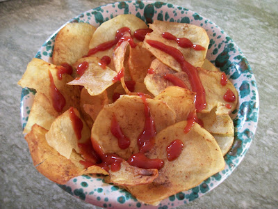 Preheat the oven to 180 degrees. Peel the potatoes and slice finely (but not too much) by using a slicer (If you do not have it do it by hand but would be much better with the slicer). Then enter the''sheets''in a bowl and mix well with paprika, potatoes and seasonings for oil. I advise you to mix them by hand might otherwise break. Finally, take the chips and put them on the baking sheet covered in parchment paper always faithful. Potatoes should not be overlapped but if you do not have much time to divide them no problem, you bake it anyway. Leave it cooking for about 30 minutes, but be careful because it depends on your oven so they will be ready when they took the typical golden color and the crispness of potato chips. If like me you worship the abundant well Ketchup (Low in calories) and serve up a nice pot, even during a cocktail at home ...... Voila!